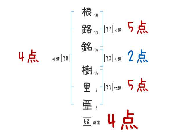 天運![]() | 根路銘樹里亜さんの天運は37画の5つ星!努力家で順応性に優れる。現実的な考え方ができ忠実に物事をこなす。 家系が持つ宿命的な運勢を表します。祖先から受け継いだ苗字ですので自分の力が及びません。家柄を象徴します。 |