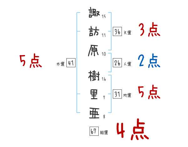 天運![]() | 諏訪原樹里亜さんの天運は36画の3つ星!先見性が豊かです。多少神経質で苦労することも。 家系が持つ宿命的な運勢を表します。祖先から受け継いだ苗字ですので自分の力が及びません。家柄を象徴します。 |
