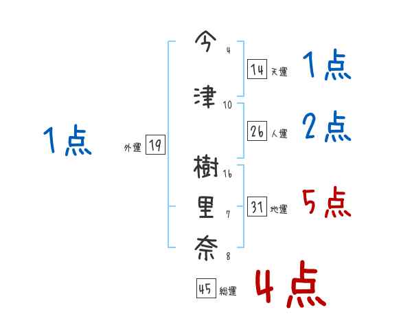 | 総運  | 今津樹里奈さんの総運は45画の4つ星!もくもくと物事を進め達成する。地味な努力家。あなたの人生を表す1番重要な運勢です。生涯を通じて影響する総合運となり、主に50歳以降の晩年期に影響を及ぼします。 |