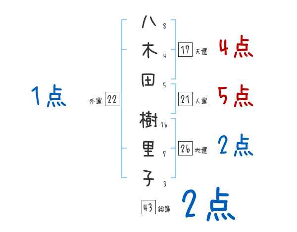 外運![]() | 八木田樹里子さんの外運は22画の1つ星!努力することが苦手ないっぽう手先が器用。芸術性にも優れる。 生活面を象徴する運勢です。外部から受ける影響力を表し、結婚運、家庭運や職場、環境への順応性を表します。 |
