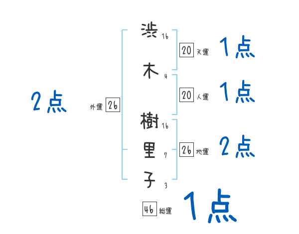 総運![]() | 渋木樹里子さんの総運は46画の1つ星!迷走することが多く苦労するかも。目先のことにとらわれないように。 あなたの人生を表す1番重要な運勢です。生涯を通じて影響する総合運となり、主に50歳以降の晩年期に影響を及ぼします。 |