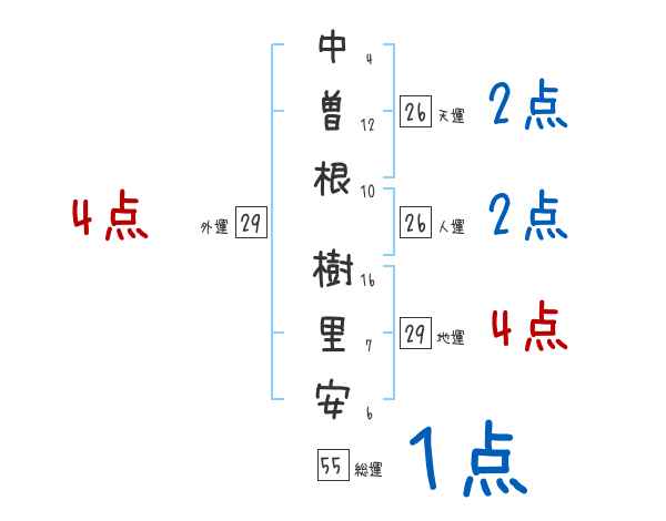 人運![]() | 中曽根樹里安さんの人運は26画の2つ星!波瀾万丈かも。信頼できる人を大事にしましょう。 性格や才能などを表す2番目に重要な運勢です。人間関係や協調性、社会的な成功に影響します。主に20歳から50歳ぐらいまでの中年期の運勢を表します。 |