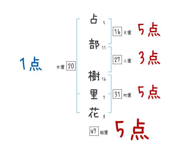 総運![]() | 占部樹里花さんの総運は47画の5つ星!実力が開花し発展する円満な人生。財に恵まれる。 あなたの人生を表す1番重要な運勢です。生涯を通じて影響する総合運となり、主に50歳以降の晩年期に影響を及ぼします。 |