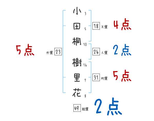 外運![]() | 小田桐樹里花さんの外運は23画の5つ星!想像力に優れ活力がある。一代で成功し名誉を手に入れる。 生活面を象徴する運勢です。外部から受ける影響力を表し、結婚運、家庭運や職場、環境への順応性を表します。 |