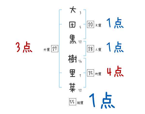 総運![]() | 大田黒樹里菜さんの総運は55画の1つ星!欲張りな性格で軽率な行動に注意しましょう。病気に気をつけて。 あなたの人生を表す1番重要な運勢です。生涯を通じて影響する総合運となり、主に50歳以降の晩年期に影響を及ぼします。 |