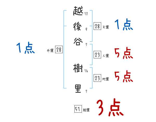 天運![]() | 越後谷樹里さんの天運は28画の1つ星!家庭環境に注意。スポーツで活躍できる能力があるかも。 家系が持つ宿命的な運勢を表します。祖先から受け継いだ苗字ですので自分の力が及びません。家柄を象徴します。 |