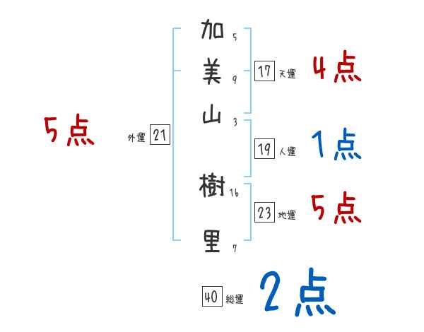 外運![]() | 加美山樹里さんの外運は21画の5つ星!統率力がある。独立し成功する。名誉を手に入れる。 生活面を象徴する運勢です。外部から受ける影響力を表し、結婚運、家庭運や職場、環境への順応性を表します。 |