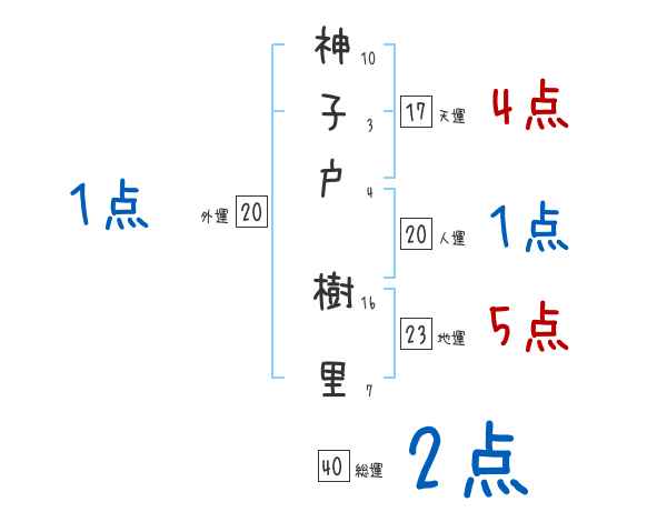 総運![]() | 神子戸樹里さんの総運は40画の2つ星!自信過剰で物事に固執するためトラブルに注意。 あなたの人生を表す1番重要な運勢です。生涯を通じて影響する総合運となり、主に50歳以降の晩年期に影響を及ぼします。 |