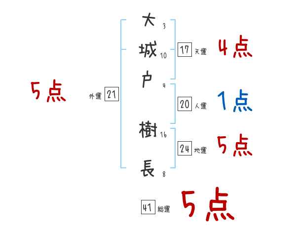外運![]() | 大城戸樹長さんの外運は21画の5つ星!統率力がある。独立し成功する。名誉を手に入れる。 生活面を象徴する運勢です。外部から受ける影響力を表し、結婚運、家庭運や職場、環境への順応性を表します。 |