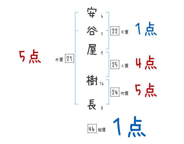 総運![]() | 安谷屋樹長さんの総運は46画の1つ星!迷走することが多く苦労するかも。目先のことにとらわれないように。 あなたの人生を表す1番重要な運勢です。生涯を通じて影響する総合運となり、主に50歳以降の晩年期に影響を及ぼします。 |