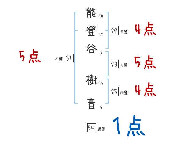 総運![]() | 能登谷樹音さんの総運は54画の1つ星!トラブルが多いかも。周りをよく見て協調して過ごしましょう。 あなたの人生を表す1番重要な運勢です。生涯を通じて影響する総合運となり、主に50歳以降の晩年期に影響を及ぼします。 |