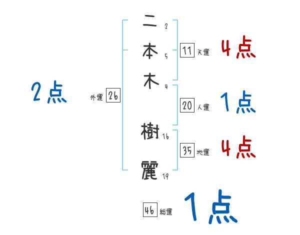 天運![]() | 二本木樹麗さんの天運は11画の4つ星!着実に富や地位を得る幸運な人生。 家系が持つ宿命的な運勢を表します。祖先から受け継いだ苗字ですので自分の力が及びません。家柄を象徴します。 |
