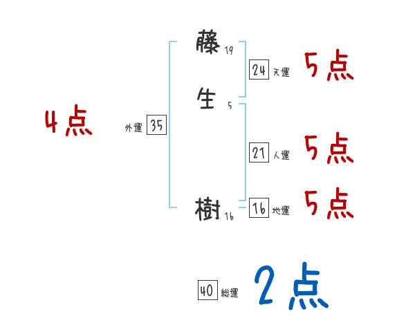 天運![]() | 藤生樹さんの天運は24画の5つ星!家庭運が良く順調な人生。金運にも恵まれる。 家系が持つ宿命的な運勢を表します。祖先から受け継いだ苗字ですので自分の力が及びません。家柄を象徴します。 |