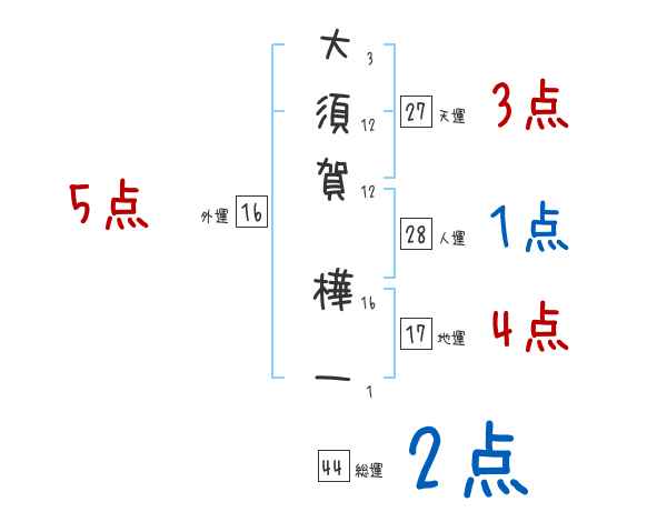 天運![]() | 大須賀樺一さんの天運は27画の3つ星!頭脳明晰だが強情で摩擦が多い傾向。孤立に注意。 家系が持つ宿命的な運勢を表します。祖先から受け継いだ苗字ですので自分の力が及びません。家柄を象徴します。 |