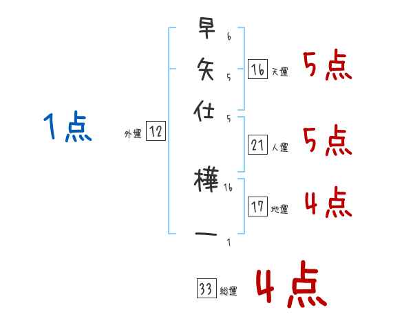 天運![]() | 早矢仕樺一さんの天運は16画の5つ星!人望が厚く大きく発展する。逆転成功が見える。 家系が持つ宿命的な運勢を表します。祖先から受け継いだ苗字ですので自分の力が及びません。家柄を象徴します。 |