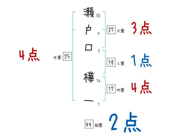人運![]() | 瀬戸口樺一さんの人運は19画の1つ星!優れた才能を持ちますが、協調性が足りないことも。周りの人と協力する事を意識しましょう。 性格や才能などを表す2番目に重要な運勢です。人間関係や協調性、社会的な成功に影響します。主に20歳から50歳ぐらいまでの中年期の運勢を表します。 |