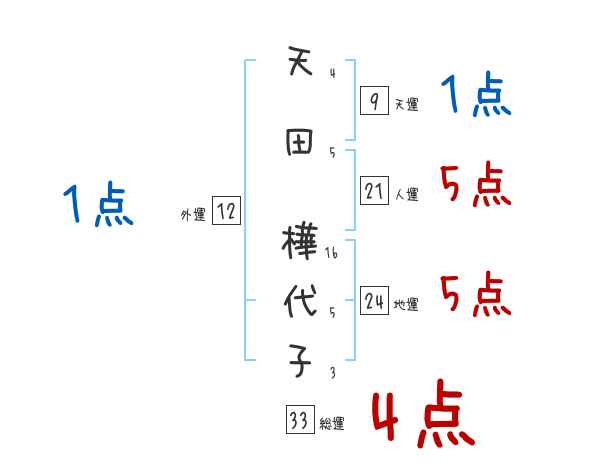 天運![]() | 天田樺代子さんの天運は9画の1つ星!消極的で才能を発揮することが苦手なことも。周りの意見に耳を傾けましょう。 家系が持つ宿命的な運勢を表します。祖先から受け継いだ苗字ですので自分の力が及びません。家柄を象徴します。 |