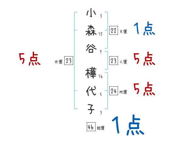 外運![]() | 小森谷樺代子さんの外運は23画の5つ星!想像力に優れ活力がある。一代で成功し名誉を手に入れる。 生活面を象徴する運勢です。外部から受ける影響力を表し、結婚運、家庭運や職場、環境への順応性を表します。 |