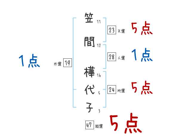天運![]() | 笠間樺代子さんの天運は23画の5つ星!想像力に優れ活力がある。一代で成功し名誉を手に入れる。 家系が持つ宿命的な運勢を表します。祖先から受け継いだ苗字ですので自分の力が及びません。家柄を象徴します。 |