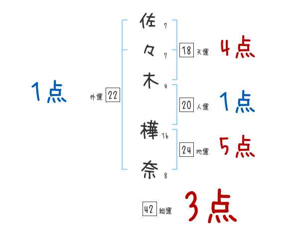 天運![]() | 佐々木樺奈さんの天運は18画の4つ星!情熱的で剛気。忍耐力があり信頼される。 家系が持つ宿命的な運勢を表します。祖先から受け継いだ苗字ですので自分の力が及びません。家柄を象徴します。 |
