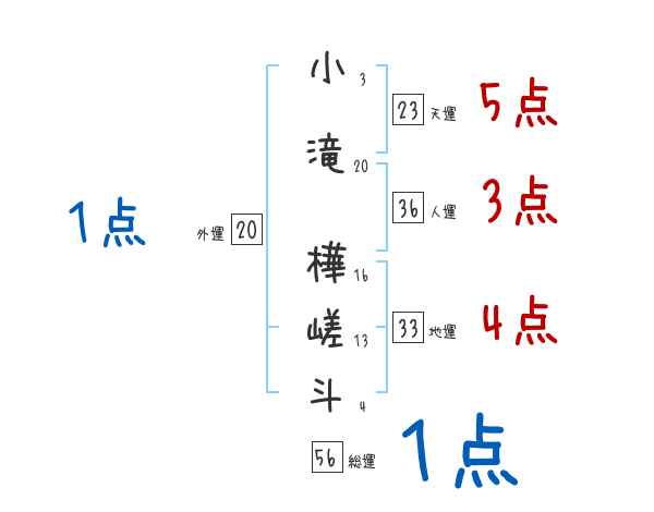 天運![]() | 小滝樺嵯斗さんの天運は23画の5つ星!想像力に優れ活力がある。一代で成功し名誉を手に入れる。 家系が持つ宿命的な運勢を表します。祖先から受け継いだ苗字ですので自分の力が及びません。家柄を象徴します。 |