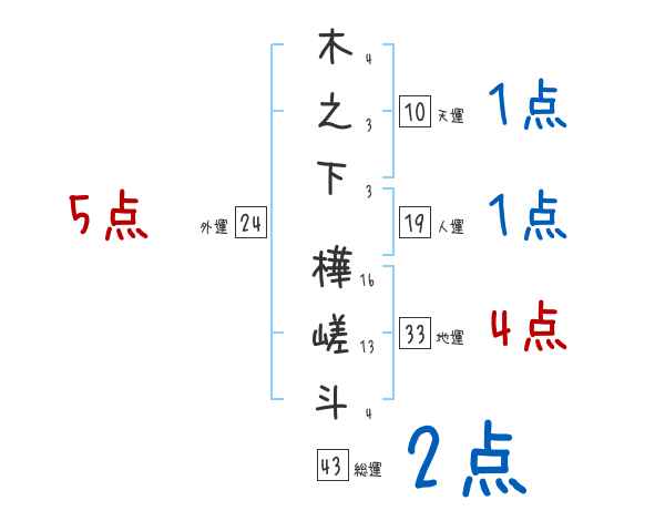 外運![]() | 木之下樺嵯斗さんの外運は24画の5つ星!家庭運が良く順調な人生。金運にも恵まれる。 生活面を象徴する運勢です。外部から受ける影響力を表し、結婚運、家庭運や職場、環境への順応性を表します。 |