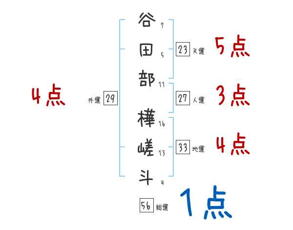 天運![]() | 谷田部樺嵯斗さんの天運は23画の5つ星!想像力に優れ活力がある。一代で成功し名誉を手に入れる。 家系が持つ宿命的な運勢を表します。祖先から受け継いだ苗字ですので自分の力が及びません。家柄を象徴します。 |