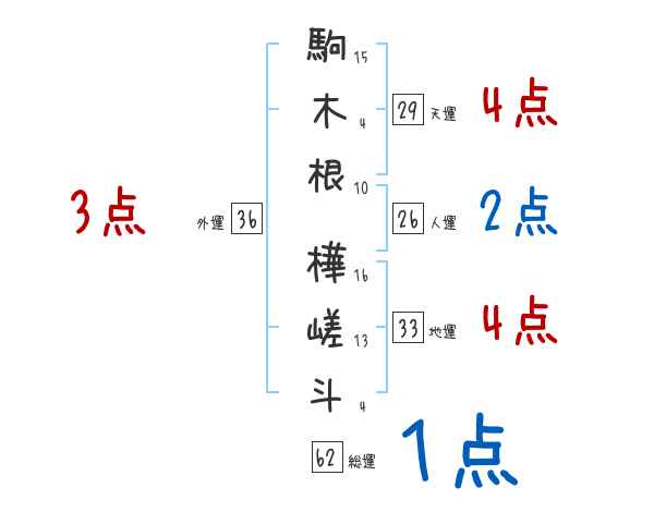 天運![]() | 駒木根樺嵯斗さんの天運は29画の4つ星!完全主義で才能がある。厳格な心の持ち主。 家系が持つ宿命的な運勢を表します。祖先から受け継いだ苗字ですので自分の力が及びません。家柄を象徴します。 |