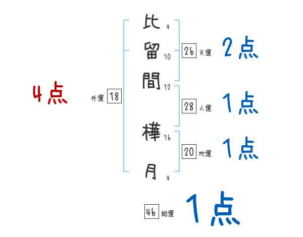 総運![]() | 比留間樺月さんの総運は46画の1つ星!迷走することが多く苦労するかも。目先のことにとらわれないように。 あなたの人生を表す1番重要な運勢です。生涯を通じて影響する総合運となり、主に50歳以降の晩年期に影響を及ぼします。 |