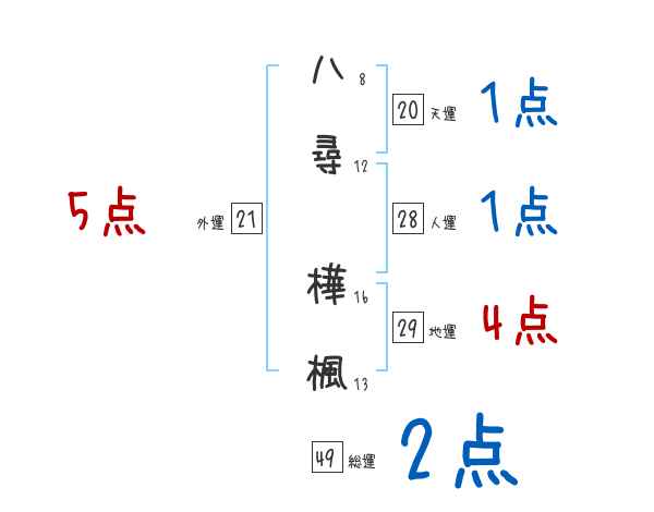 人運![]() | 八尋樺楓さんの人運は28画の1つ星!家庭環境に注意。スポーツで活躍できる能力があるかも。 性格や才能などを表す2番目に重要な運勢です。人間関係や協調性、社会的な成功に影響します。主に20歳から50歳ぐらいまでの中年期の運勢を表します。 |