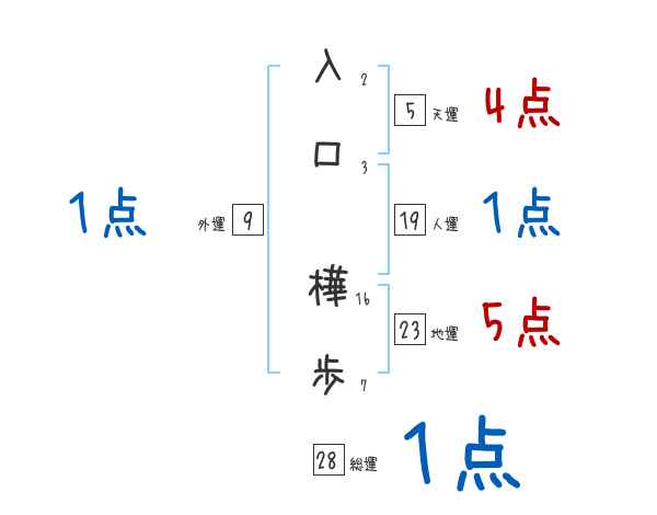 天運![]() | 入口樺歩さんの天運は5画の4つ星!健康で安泰。協調性に優れ、財産に恵まれる。 家系が持つ宿命的な運勢を表します。祖先から受け継いだ苗字ですので自分の力が及びません。家柄を象徴します。 |