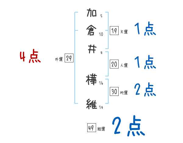 天運![]() | 加倉井樺維さんの天運は19画の1つ星!優れた才能を持ちますが、協調性が足りないことも。周りの人と協力する事を意識しましょう。 家系が持つ宿命的な運勢を表します。祖先から受け継いだ苗字ですので自分の力が及びません。家柄を象徴します。 |