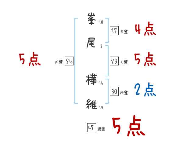 人運![]() | 峯尾樺維さんの人運は23画の5つ星!想像力に優れ活力がある。一代で成功し名誉を手に入れる。 性格や才能などを表す2番目に重要な運勢です。人間関係や協調性、社会的な成功に影響します。主に20歳から50歳ぐらいまでの中年期の運勢を表します。 |