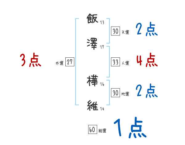 天運![]() | 飯澤樺維さんの天運は30画の2つ星!浮き沈みの激しさに注意しましょう。 家系が持つ宿命的な運勢を表します。祖先から受け継いだ苗字ですので自分の力が及びません。家柄を象徴します。 |