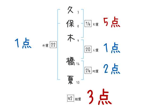 天運![]() | 久保木橋夏さんの天運は16画の5つ星!人望が厚く大きく発展する。逆転成功が見える。 家系が持つ宿命的な運勢を表します。祖先から受け継いだ苗字ですので自分の力が及びません。家柄を象徴します。 |