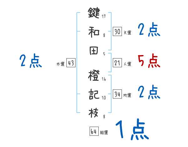 天運![]() | 鍵和田橙記枝さんの天運は30画の2つ星!浮き沈みの激しさに注意しましょう。 家系が持つ宿命的な運勢を表します。祖先から受け継いだ苗字ですので自分の力が及びません。家柄を象徴します。 |