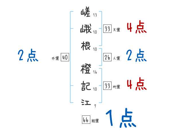 天運![]() | 嵯峨根橙記江さんの天運は33画の4つ星!権力志向でプライドが高い。勇気があり運を切り開き成功する。 家系が持つ宿命的な運勢を表します。祖先から受け継いだ苗字ですので自分の力が及びません。家柄を象徴します。 |