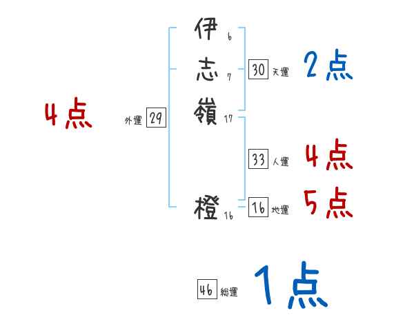 総運![]() | 伊志嶺橙さんの総運は46画の1つ星!迷走することが多く苦労するかも。目先のことにとらわれないように。 あなたの人生を表す1番重要な運勢です。生涯を通じて影響する総合運となり、主に50歳以降の晩年期に影響を及ぼします。 |