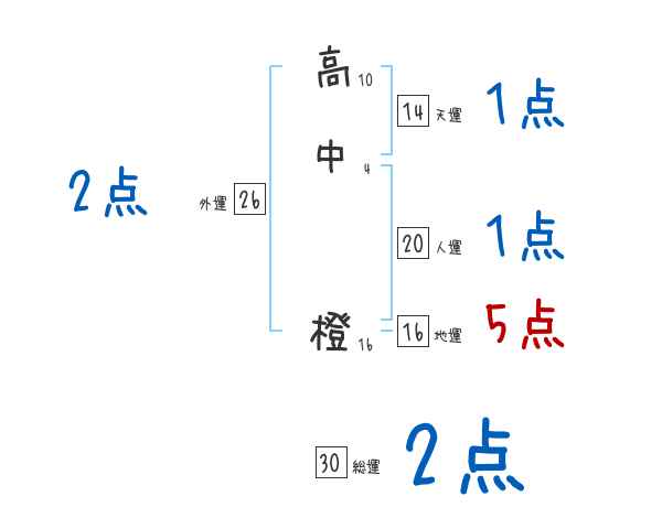外運![]() | 高中橙さんの外運は26画の2つ星!波瀾万丈かも。信頼できる人を大事にしましょう。 生活面を象徴する運勢です。外部から受ける影響力を表し、結婚運、家庭運や職場、環境への順応性を表します。 |