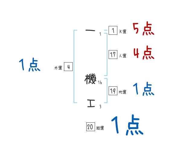 天運![]() | 一機工さんの天運は1画の5つ星!行動力、指導力があり出世し繁栄する。幸運に恵まれる。 家系が持つ宿命的な運勢を表します。祖先から受け継いだ苗字ですので自分の力が及びません。家柄を象徴します。 |