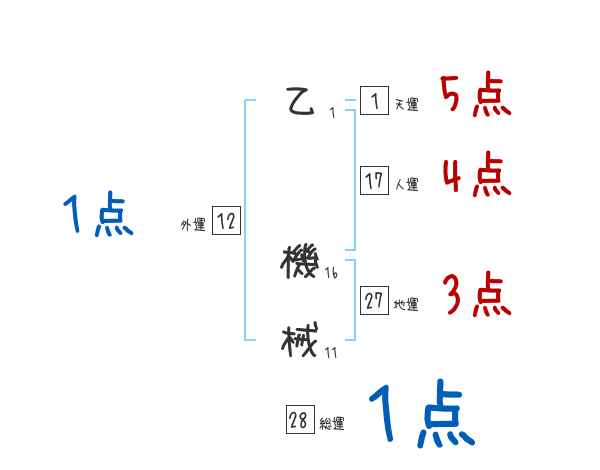天運![]() | 乙機械さんの天運は1画の5つ星!行動力、指導力があり出世し繁栄する。幸運に恵まれる。 家系が持つ宿命的な運勢を表します。祖先から受け継いだ苗字ですので自分の力が及びません。家柄を象徴します。 |