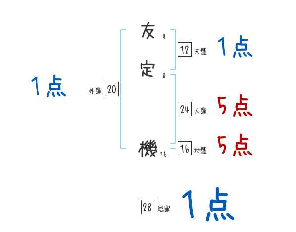 天運![]() | 友定機さんの天運は12画の1つ星!簡単な失敗で諦めてしまいやすいかも。着実に行動すると良いでしょう。 家系が持つ宿命的な運勢を表します。祖先から受け継いだ苗字ですので自分の力が及びません。家柄を象徴します。 |
