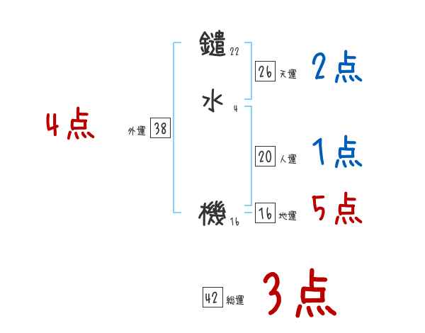 天運![]() | 鑓水機さんの天運は26画の2つ星!波瀾万丈かも。信頼できる人を大事にしましょう。 家系が持つ宿命的な運勢を表します。祖先から受け継いだ苗字ですので自分の力が及びません。家柄を象徴します。 |