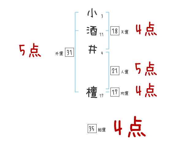 総運![]() | 小酒井檀さんの総運は35画の4つ星!温厚な性格で感受性が高い。穏和な性格で人望が厚い。 あなたの人生を表す1番重要な運勢です。生涯を通じて影響する総合運となり、主に50歳以降の晩年期に影響を及ぼします。 |