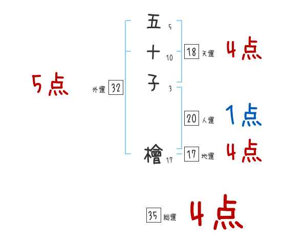 天運![]() | 五十子檜さんの天運は18画の4つ星!情熱的で剛気。忍耐力があり信頼される。 家系が持つ宿命的な運勢を表します。祖先から受け継いだ苗字ですので自分の力が及びません。家柄を象徴します。 |