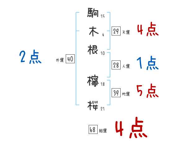 天運![]() | 駒木根檸桜さんの天運は29画の4つ星!完全主義で才能がある。厳格な心の持ち主。 家系が持つ宿命的な運勢を表します。祖先から受け継いだ苗字ですので自分の力が及びません。家柄を象徴します。 |