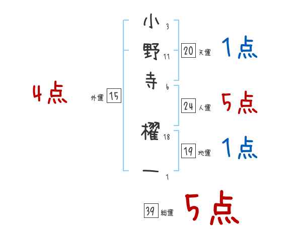人運![]() | 小野寺櫂一さんの人運は24画の5つ星!家庭運が良く順調な人生。金運にも恵まれる。 性格や才能などを表す2番目に重要な運勢です。人間関係や協調性、社会的な成功に影響します。主に20歳から50歳ぐらいまでの中年期の運勢を表します。 |