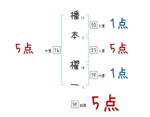 総運![]() | 播本櫂一さんの総運は39画の5つ星!社交性に優れ人望が厚い。人の上に立ち成功する。 あなたの人生を表す1番重要な運勢です。生涯を通じて影響する総合運となり、主に50歳以降の晩年期に影響を及ぼします。 |