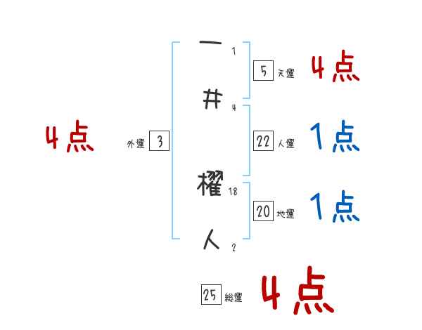 天運![]() | 一井櫂人さんの天運は5画の4つ星!健康で安泰。協調性に優れ、財産に恵まれる。 家系が持つ宿命的な運勢を表します。祖先から受け継いだ苗字ですので自分の力が及びません。家柄を象徴します。 |