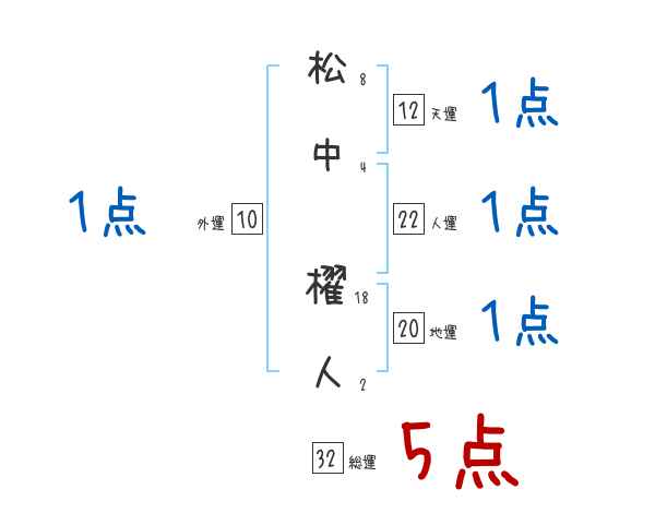 総運![]() | 松中櫂人さんの総運は32画の5つ星!柔軟性があり成功する。チャンスが多く金運が良い。 あなたの人生を表す1番重要な運勢です。生涯を通じて影響する総合運となり、主に50歳以降の晩年期に影響を及ぼします。 |